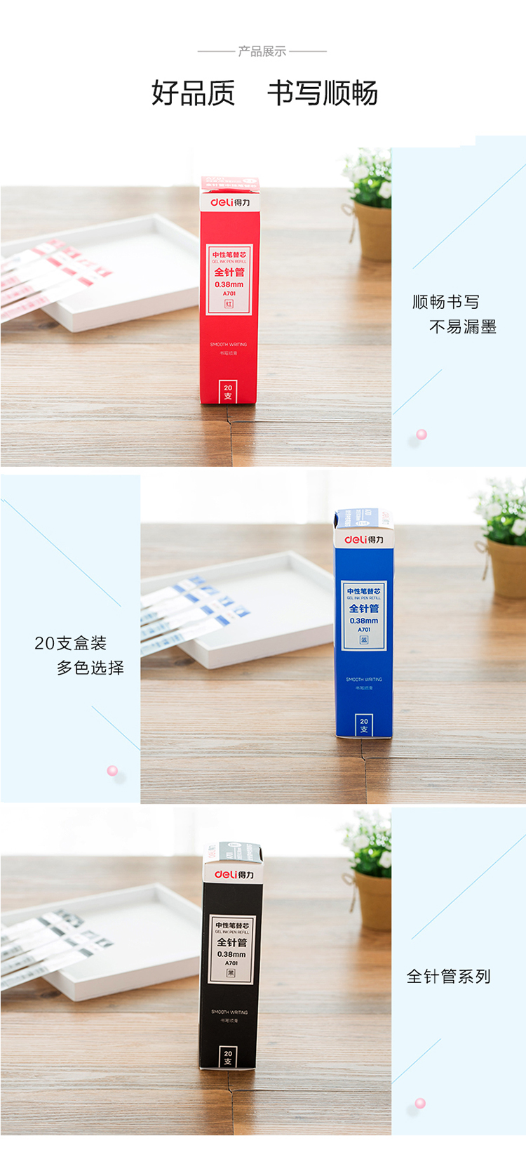 商品名称:得力(deli)全针管0.38mm蓝色中性笔水性笔签字笔替芯 20支/盒A701
